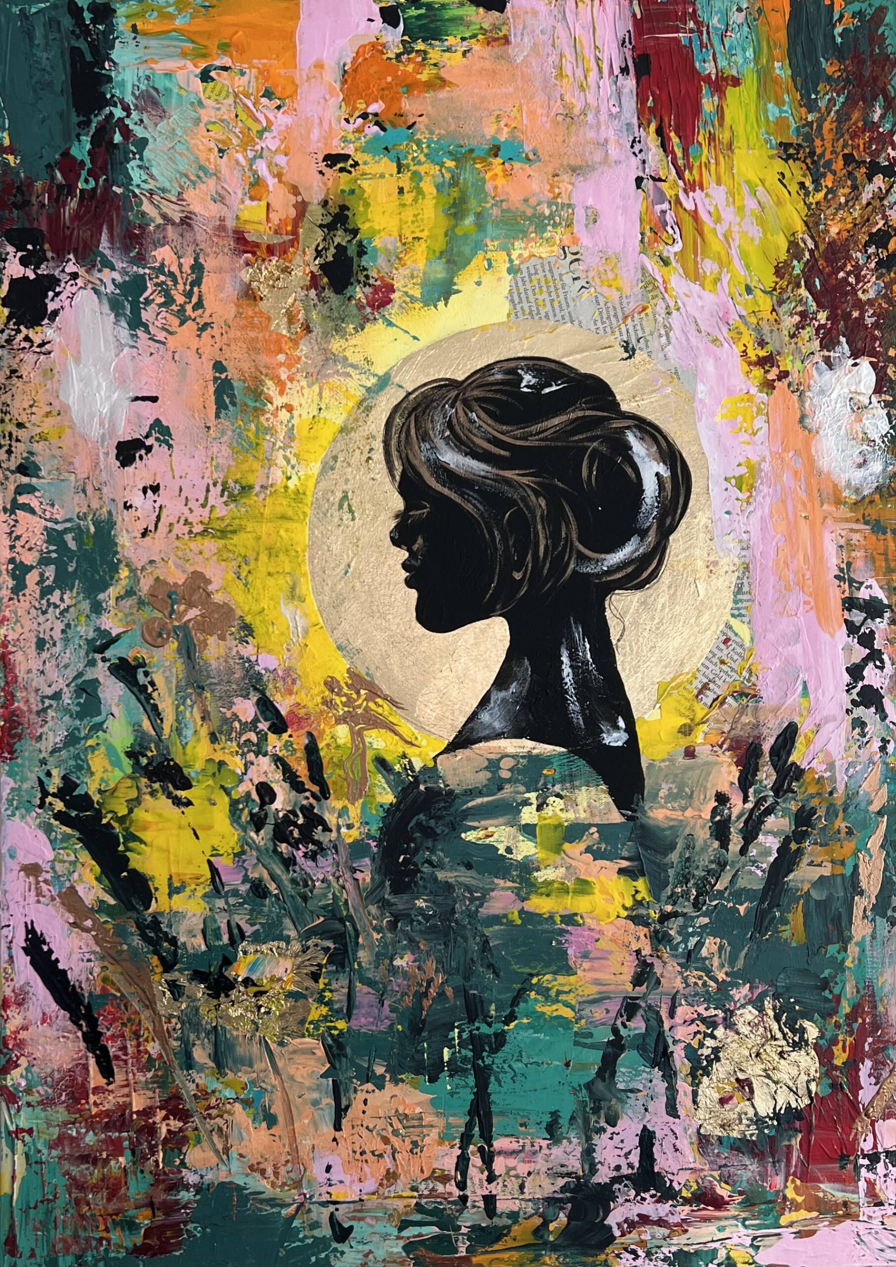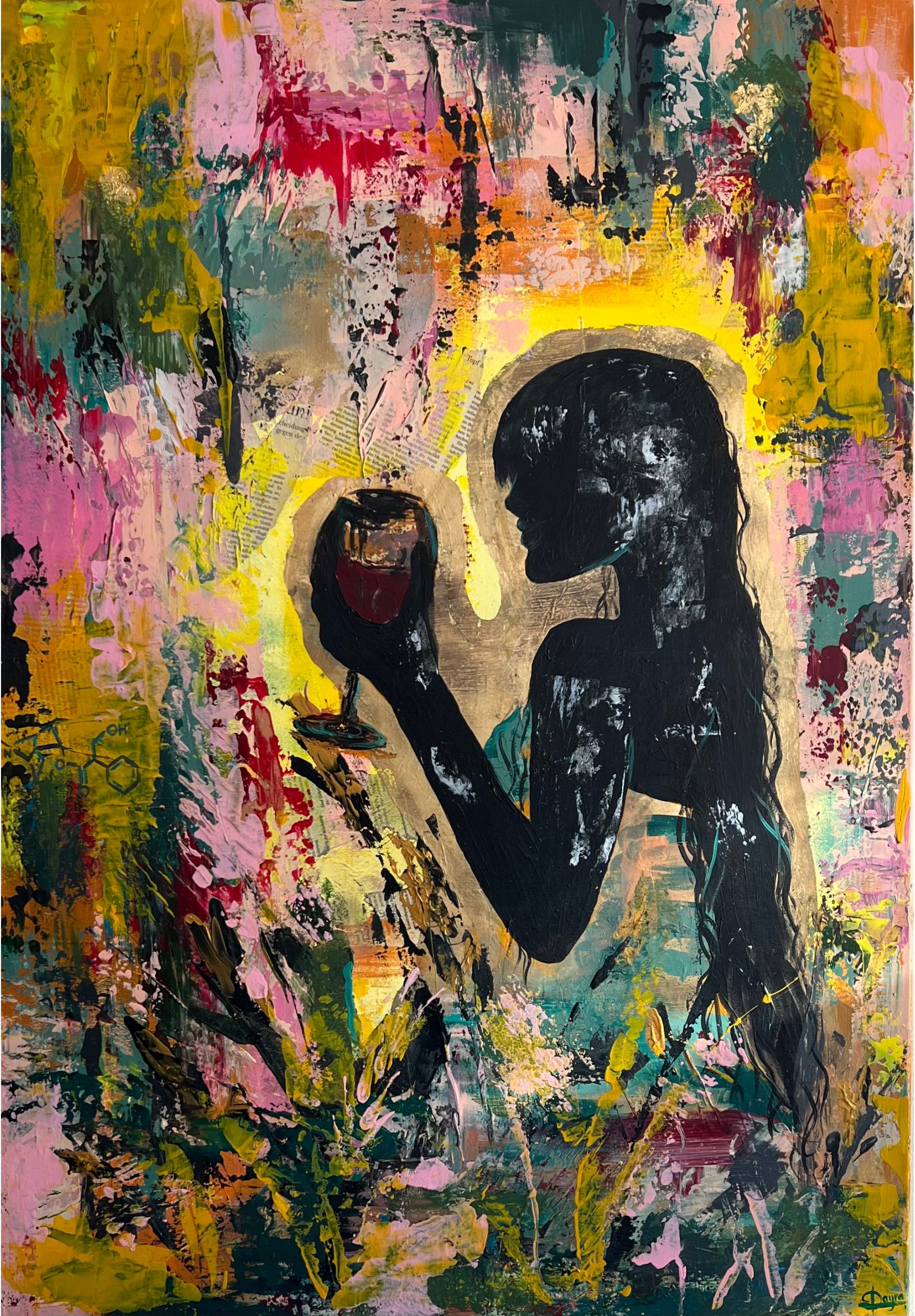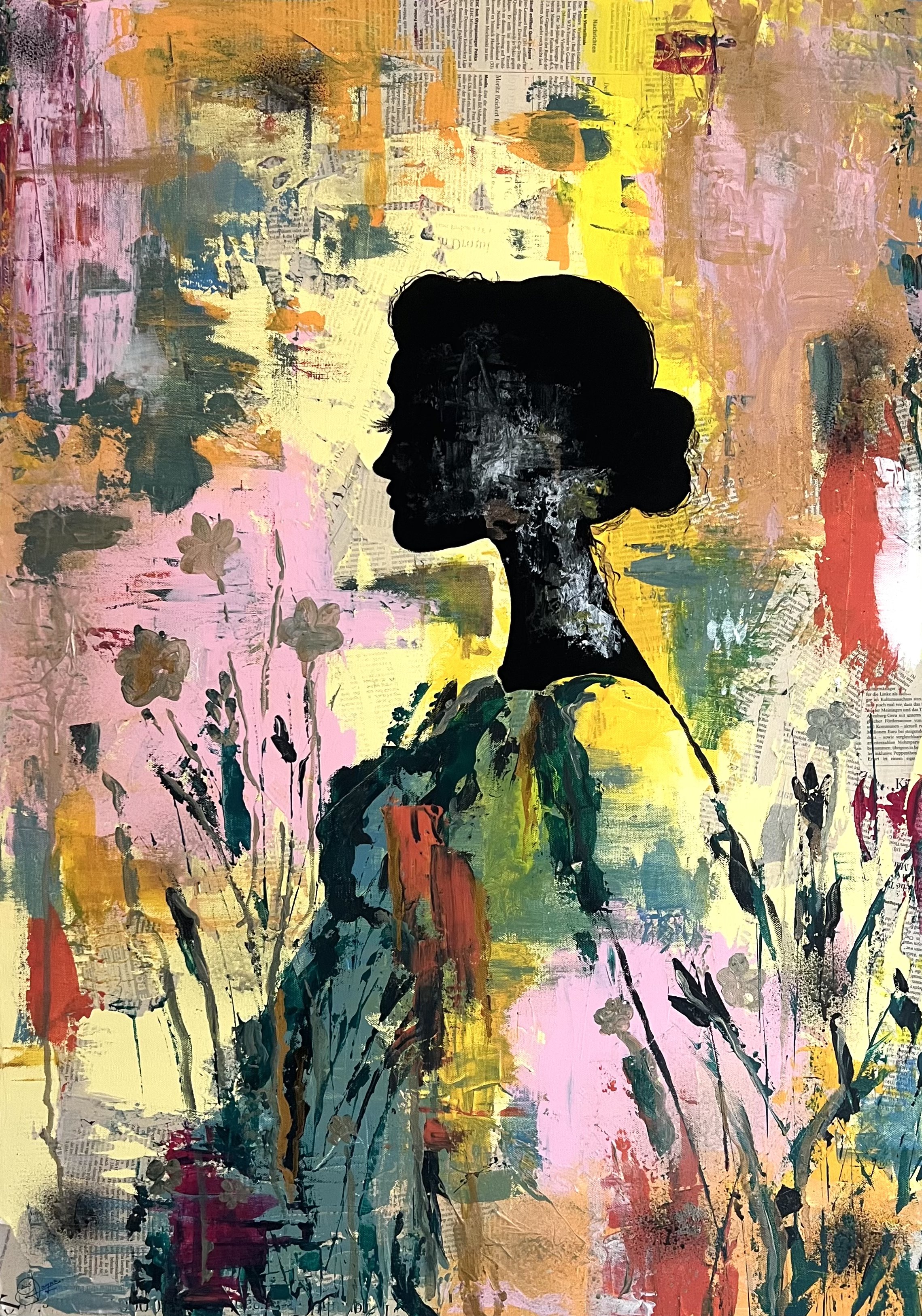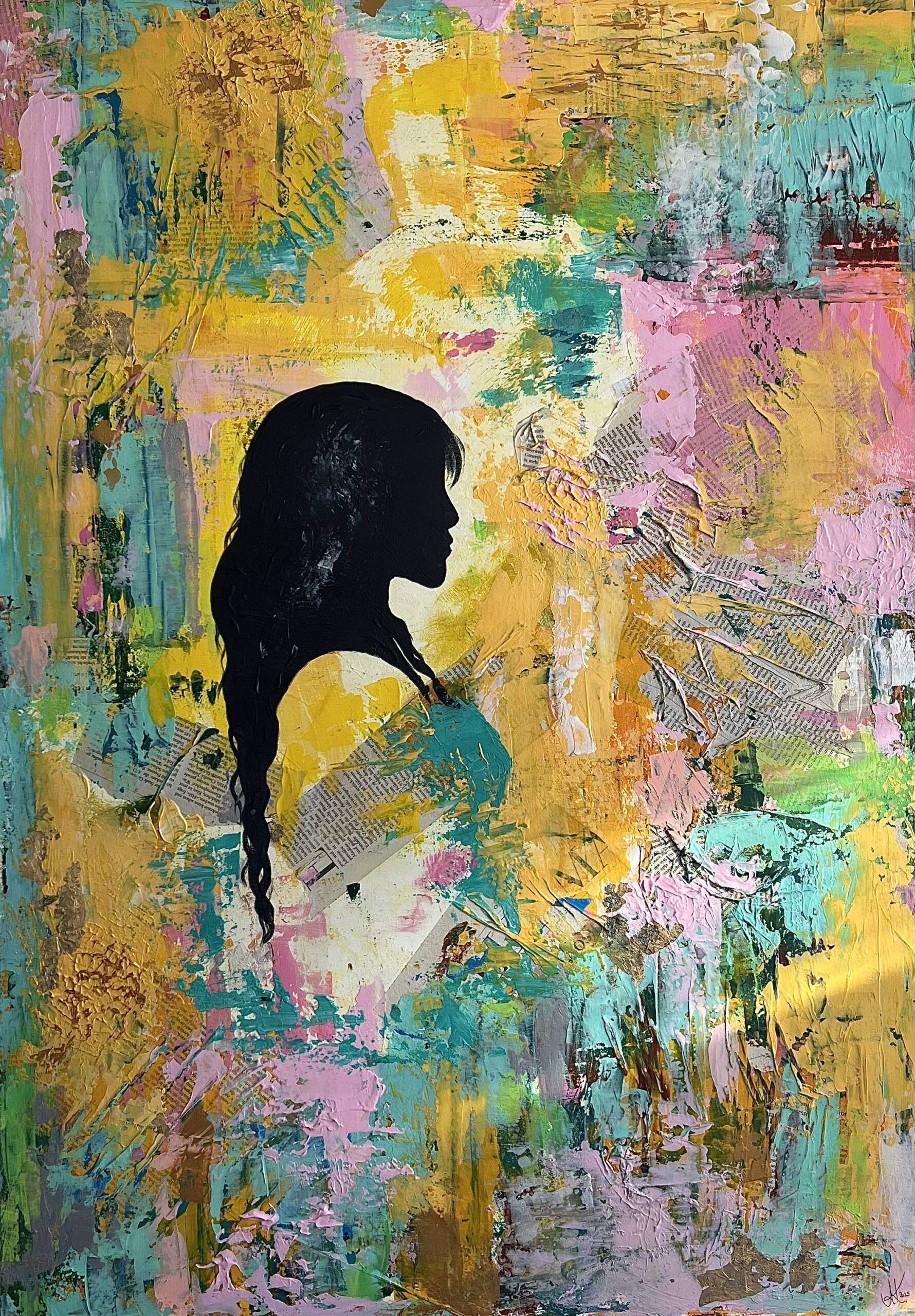 In meinen Bildern verbinde ich Farbe, Collage und figurative Elemente zu intuitiven Kompositionen.